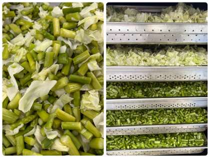 「グリーンアスパラガスとキャベツのサラダ」は焼き物機で蒸し、砂糖、塩、ワインビネガー、綿実油で作ったドレッシングをかけ、あえました。