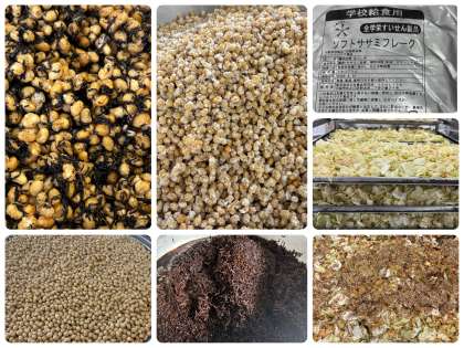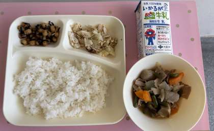 給食のひじき豆は、大豆を油であげ、ひじき、さとう、しょうゆを合わせたたれをからませて作ります。かみごたえのある料理で、鉄や食物繊維を多く含む献立です。