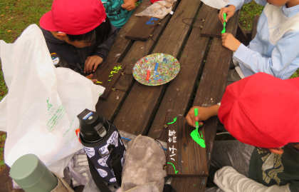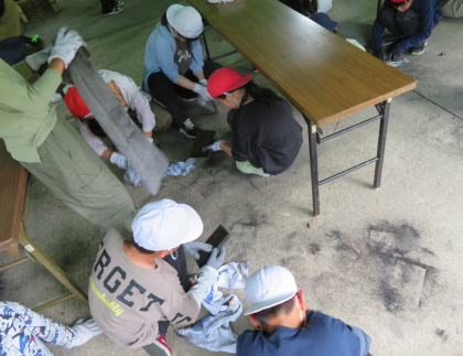 焼き板を古タオルでピカピカに磨き、思い出を振り返りながら色付けをしました。