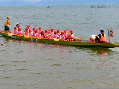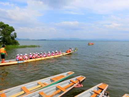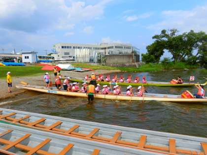 カヌーの後は、ドラゴンボート、2艇に分かれて競争です!