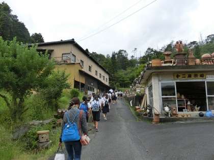 中:信楽焼き窯元に到着、タヌキの出迎え?です!