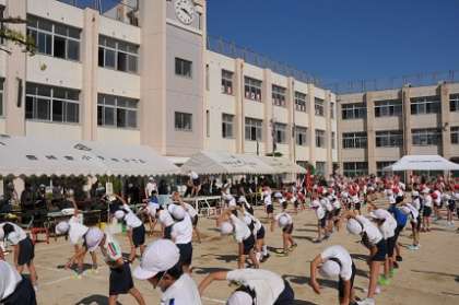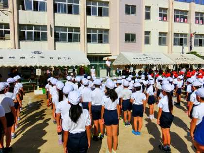 下:まずは、全学年児童のラジオ体操、プログラムのスタートです‼