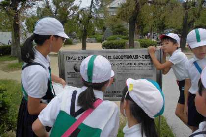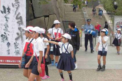 たてわり班で城内のオリエンテーリングです、高学年がリーダーシップを発揮します!