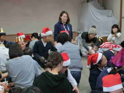 サンタクロースが登場し、プレゼントを手渡します♪5年生もお手伝い♪
