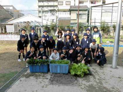 4年生は、ホウレンソウ、ミズナ、山東菜を収穫です!11月初旬に定植し、約90日間じっくりと育て上げました!