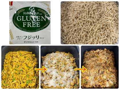「カレーマカロニグラタン」は、鶏肉、マカロニ(米粉)、たまねぎ、マッシュルーム、彩にグリンピースを使用したカレー味のグラタンです。クリームや小麦粉、牛乳を使用せず、カレールウの素(米粉)や上新粉などを使用し、乳・小麦アレルギーのある児童も食べることができます。