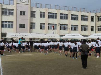 今日の1時間目、運動場で全体練習をしました。
