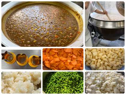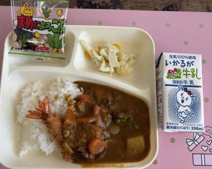今日の給食は子どもたちに大好評のメニューのカレーライスにえびフライがつきました。「えびフライや!やったー!」っと大喜びでした。