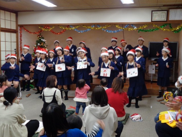 5年2組と3組がサンタの帽子をかぶって参加しました。