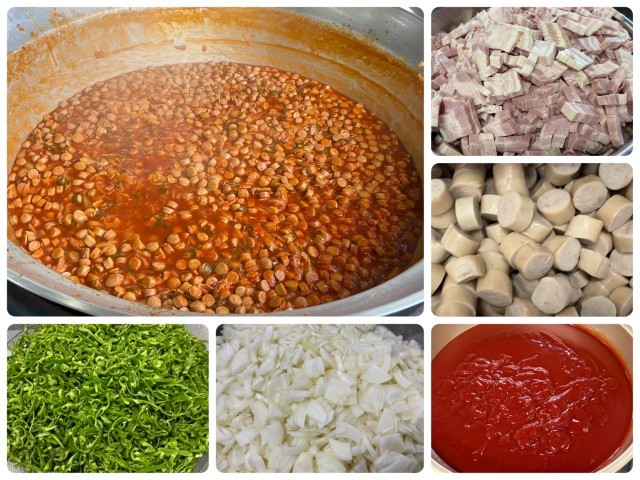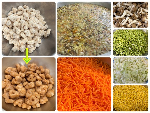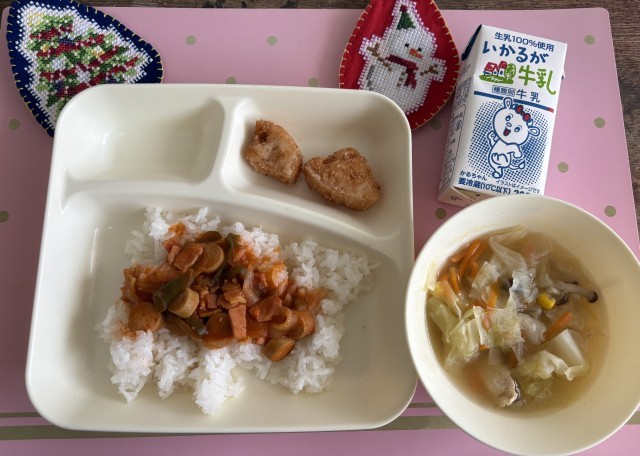「ケチャップライス(具)」は、ウインナー、ベーコン、たまねぎ、ピーマンをいため、ケチャップ、ウスターソース、塩、カレー粉で味つけした具をご飯にかけ、混ぜ合わせて食べます。子どもたちに人気のあるケチャップ味に仕上げています。