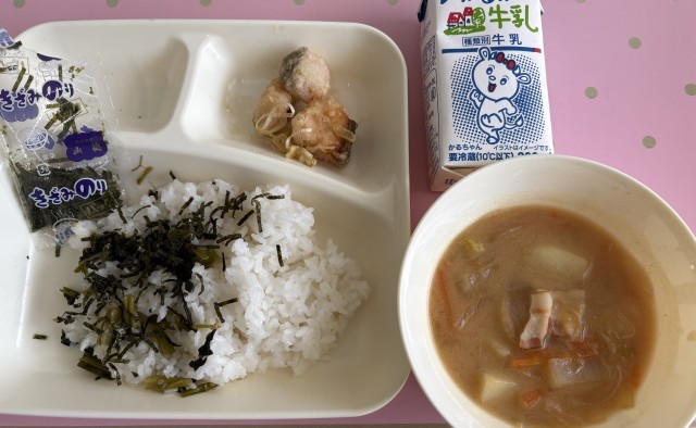 「じゃがいもとベーコンのみそ汁」は、にぼしでだしをとり、ベーコン、じゃがいも、たまねぎ、はくさい、にんじんを使用した彩りのよいみそ汁です。ベーコンのうまみもよく出て美味しかったです。