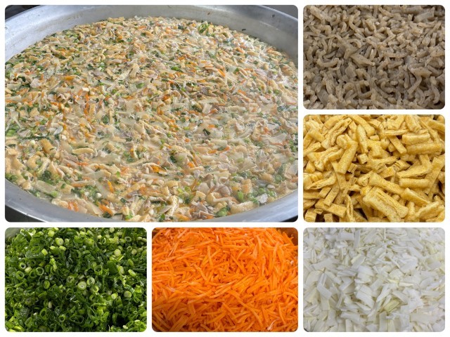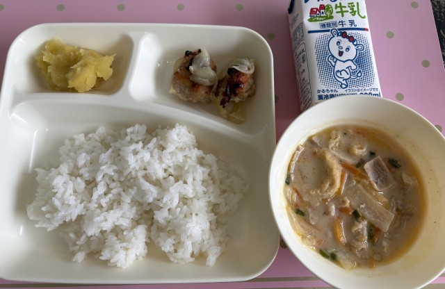 今日の給食のかす汁は、豚肉、つきこんにゃく、うすあげ、だいこん、にんじん、青ねぎが入っています。