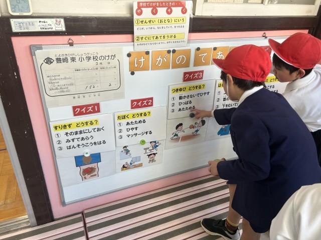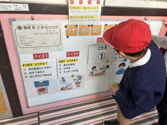 1月の発育測定時に「けがについて」保健指導をしました。その内容をクイズにして掲示しています。