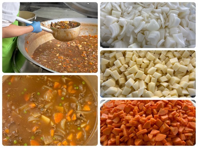 「ビーフシチュー」はケチャップ、トマトピューレ、デミグラスソース(米粉)、トンカツソース、チキンブイヨンなどで味をつけし、上新粉でとろみをつけて煮込みます。デミグラスソース(米粉)を使用することで、コクや旨みを出すようにしています。小麦アレルギーの子どもも食べることができます。