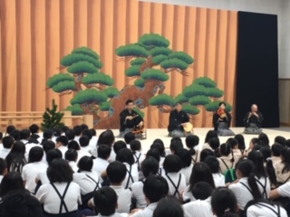 大淀コミュニティセンターで、5年生が能楽を体験・鑑賞しました。演目は狂言「附子」(ぶす)と、能「高砂」でした。北区の事業の一環で、近隣4校も一緒でした。ふだんは見慣れない笛や太鼓、小鼓、大鼓などを間近に鑑賞しました。能楽は迫力満点でした。