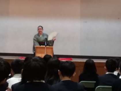 5・6年生対象に講談師の旭堂南春さんに講談を聞かせていただきました。まず、最初に、講談になじみのない子どもたちのために、講談のことや道具について説明をしていただきました。そして、「Momotaro The Battle of Demon Island」(桃太郎)をしていただきました。最後には、質問にも答えていただきました。。子どもたちは、よい経験ができたと思います。