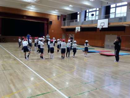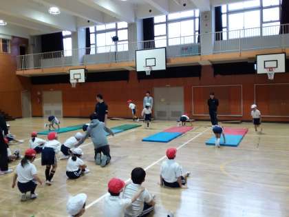 今日が低学年対象にクラスごとに前転や身体の動かし方を教えていただきました。子どもたちの多くがコツをつかんで意欲的に取り組むことができました。
