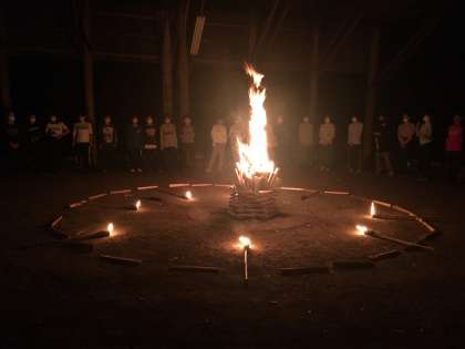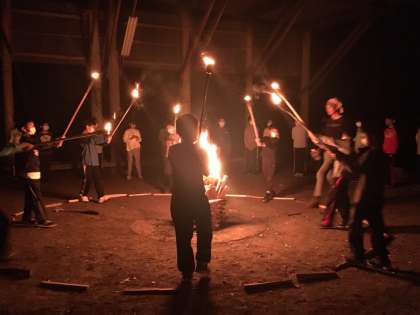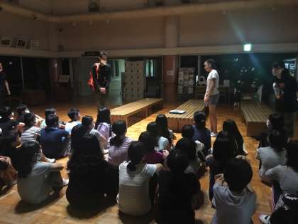 夜には、キャンプファイヤーを行いました。周りに建物がないこともあり、中心にある炎がきれいでした。ゲストティーチャーのもっちさんに登山に引き続き参加してもらうとともにキャンプファイヤーを盛り上げていただきました。もっちさんには、キャンプファイヤー後、宿舎においてみんなで感謝の気持ちを伝えてお別れしました。