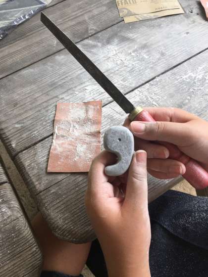 金やすりや紙やすりなどを使って一人一人丁寧に作業をしました。磨けば磨くほど光沢や丸みも出てきて、オリジナルの勾玉を作ることができました。完成品を持って帰りますので、ご家庭でご覧ください。