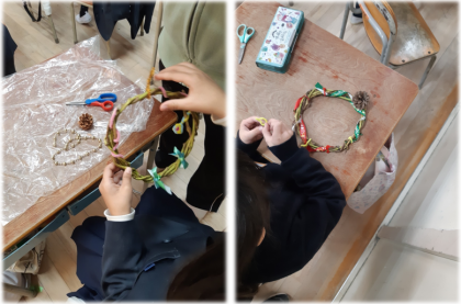 春から育てていたお芋のツルを使って作成しました。モールや松ぼっくり等で装飾し、オリジナリティー豊かな作品が、どの児童も作ることができました。