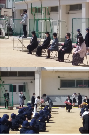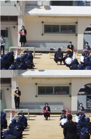 この3月末で、本校から転勤された教職員の中から、中村前校長先生、岡本先生、原田先生、河原先生、前田先生が来られました。西浦校長先生から一人一人の先生方の紹介をした後、代表の子どもたちから花束を贈呈するとともに、感謝の気持ちを伝えました。その後、それぞれの先生からお話をしてもらいました。昨年度は、新型コロナウィルス感染症の影響で行うことができませんでしたが、今年は、対策を講じながら行うことができました。たくさんの保護者の方や卒業生の来校もありました。本当にありがとうございました。