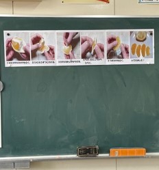 低学年は、皮のむき方の掲示を見ながら、一房ずつ外して上手に食べていました。