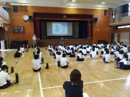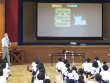 今年2月に引き続き、KDDIの方にお話をいただきました。動画やSNS,ゲーム等の依存症による体の不調、学力不振、人間関係の悪化など悪影響が多い事、また、SNSにより書き込みによるトラブルなど身近な内容だったこともあり、自分事として子どもたちは真剣に聞いていました。