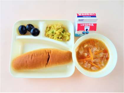 黒糖パン、牛乳、豆乳マカロニグラタン、トマトスープ、ぶどう(巨峰)