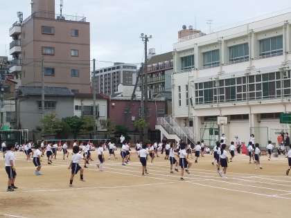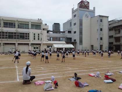 また、密を防ぐため、2部制にして、第1部は、開会式と1〜3年の個人走と団体演技を1〜3年の観覧のもと行いました。4〜6年は、教室で画面を見ながら参加しました。