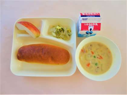 パンプキンパン、牛乳、コーンクリームシチュー[米粉]、はくさいのピクルス、りんご