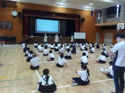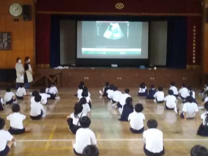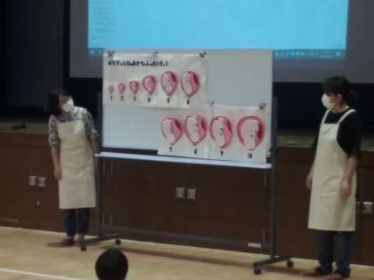 いのちスタッフ「smile pocket」の皆さんに、赤ちゃんが、0.1mmから小豆ぐらいの大きさになりそしてどんどん大きくなり、10カ月かけて育つさまを折り紙や映像などを使って、教えていただきました。その後、赤ちゃんの抱っこ体験もしました。子どもたちは、自分が生まれるまでにお母さんのおなかの中で大事に育ててもらったことに改めて気づくことができました。
