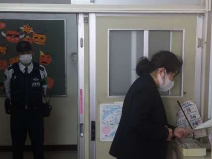 10/20の給食の時間に防犯係の方がお話いただきました。安全に過ごす方法や家族が詐欺被害を受けない事等の内容でした。お話の後、校内や学校周辺に危険箇所がないかも見ていただきました。