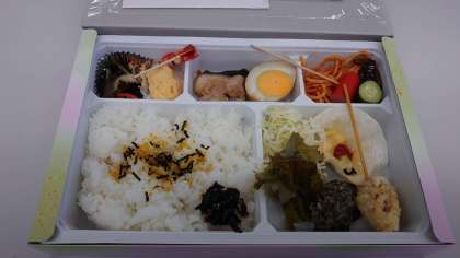 商工会議所で菅島で作って下さったお弁当を食べています。菅島の食材が入っています。