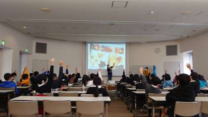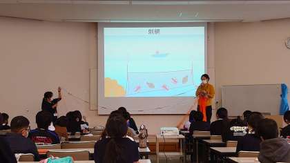 お弁当に入っていたワカメやヒジキ、タコなど、海の幸について学びました。そして、刺網も見せてもらいました。