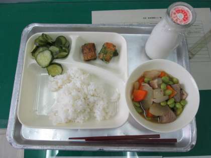 煮もの、あっさりきゅうり、米飯、牛乳です。