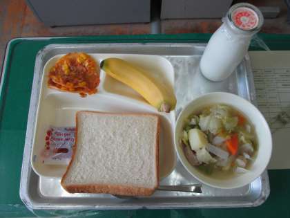 本日の給食は豚肉とキャベツのスープ煮、変わりピザ