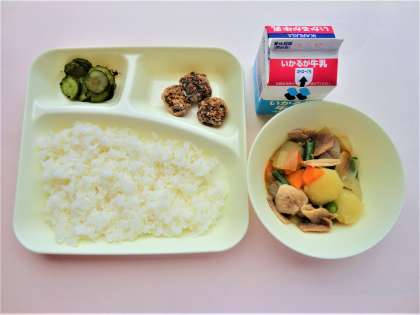 ごはん、牛乳、くじらのたつたあげ、豚肉とじゃがいもの煮もの、きゅうりの赤じそあえ