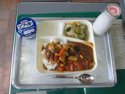 レタスのサラダ、ヨーグルト、米飯、牛乳です。
