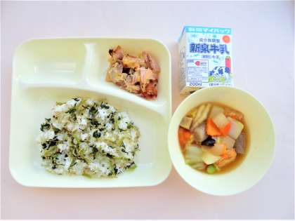 じゃこ菜っ葉ごはん、豚肉のスタミナ焼き、あつあげと冬野菜のあったか煮、牛乳