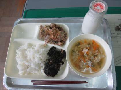 本日の給食は豚肉のごまみそ焼き、すまし汁