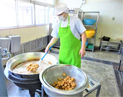 下味をつけた豚肉に衣をつけ、大きな釜でからっと揚げて完成です。