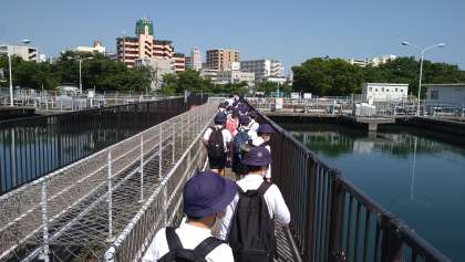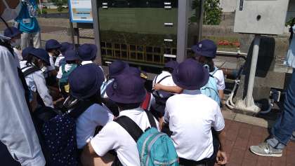 まずは、「凝集沈澱池」「排水処理施設」「急速砂ろ過池」「高度浄水処理棟」等の様々な施設を見学しました。USJと同じくらいの敷地面積ということでとても広かったですが、スタッフの方にわかりやすく説明していただき、4年生の子どもたちは、様々な施設に興味深そうに見入っていました。