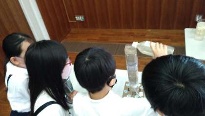 施設の見学が終わると、次は室内での参加型実験です。浄水処理工程の一部(砂・粒状活性炭ろ過)について、ミニチュア模型で実際に体験して学びました。匂いや色がついた水が、匂いのない透明な水に変化する様子に、子どもたちからは「すごい!」という声があがっていました。