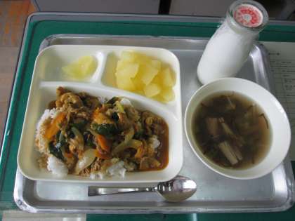 本日の給食は和風カレー丼、もずくとオクラのとろり汁