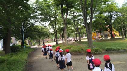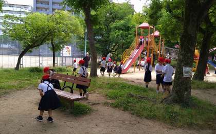 1年生が生活科の学習で「公園たんけん」をしました。学校区にある公園について知るだけではなく、公園までの道のりを、集団でマナーを守って歩くことも大切な学習です。騒いだり道に大きく広がったりすることなくしっかりと歩いて本庄公園までたどり着きました。