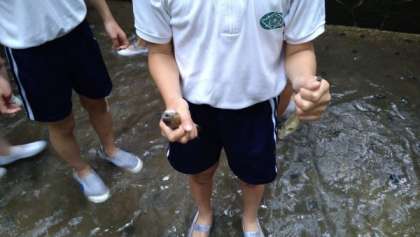 雨上りで水が濁っていて、またとても冷たいですが一生懸命に魚を探しています。何人か見事につかむことができました!