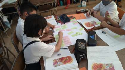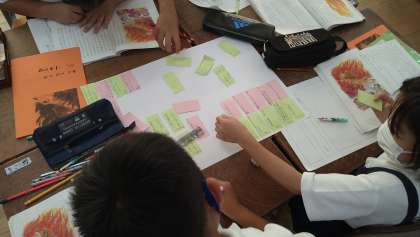 自分の考えを付箋に書いて画用紙に貼り、班の友だちと交流しました。どの子も意欲的に取り組む様子が見られました。