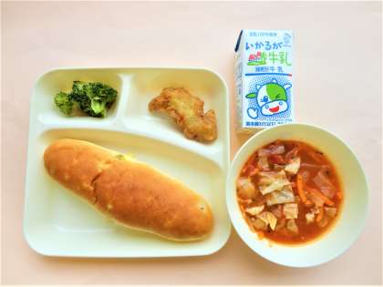 おさつパン・牛乳・白身魚フリッター・ミネストローネ・ブロッコリーのサラダ