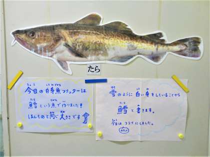 給食室前に、実物大のたらの写真を飾り、雪のように白い身なので、"鱈”と書くと紹介しました。実物の大きさに子どもたちからは驚きの声があがっていました。