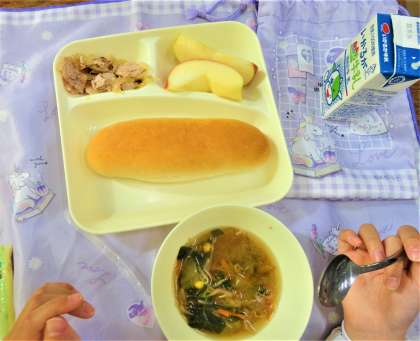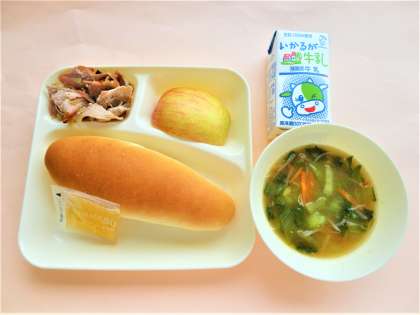 りんごは1人1/4切れですが、1年生は歯の生え変わりの時期で食べにくいことを考えて、給食調理員さんたちが1人1/8切れを2個付けにしてくれました。